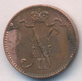 Лицевая сторона — вензель Александра II, оборотная — номинал (1 PENNIA) и дата. Нормативный вес — 1,28 грамма, гурт гладкий.