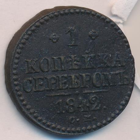 Лицевая сторона — вензель Николая I в бусовом ободке, оборотная — надпись «1 КОПЕЙКА СЕРЕБРОМ» и дата. Нормативный вес — 10,24 грамма, гурт гладкий.