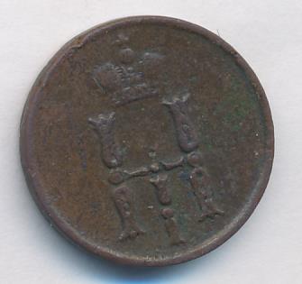 Лицевая сторона — вензель Николая I, оборотная — обозначение номинала (денежка) и дата. Нормативный вес — 2,56 грамма, гурт гладкий.