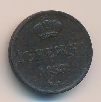 Лицевая сторона — вензель Николая I, оборотная — обозначение номинала (денежка) и дата. Нормативный вес — 2,56 грамма, гурт гладкий.
