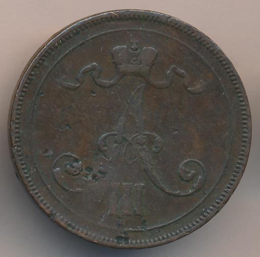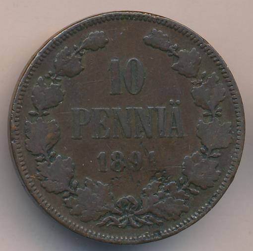 Лицевая сторона — вензель Александра II, оборотная — номинал (10 PENNIA) в венке из дубовых ветвей и дата. Нормативный вес — 12,80 грамма, гурт гладкий.
