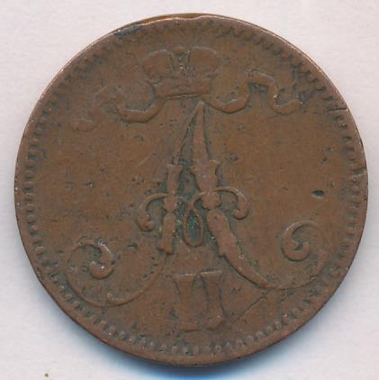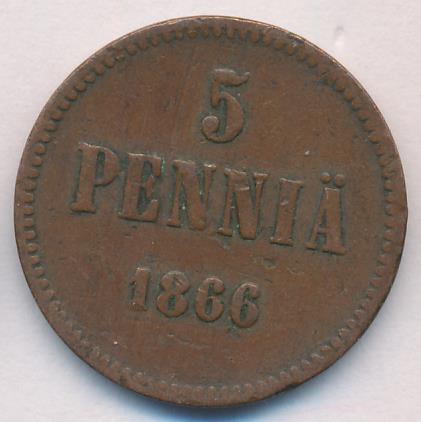 Лицевая сторона — вензель Александра II, оборотная — номинал (5 PENNIA) и дата. Нормативный вес — 6,40 грамма, гурт гладкий.