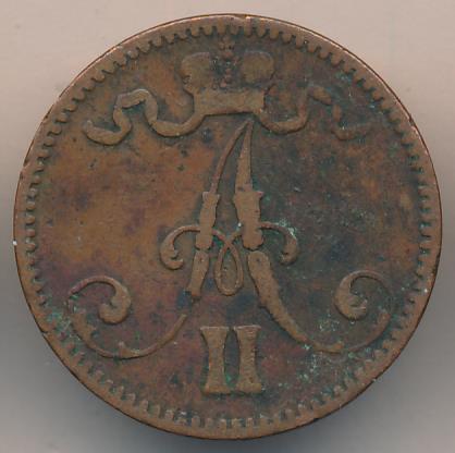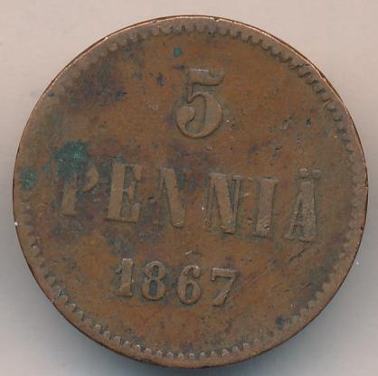 Лицевая сторона — вензель Александра II, оборотная — номинал (5 PENNIA) и дата. Нормативный вес — 6,40 грамма, гурт гладкий.