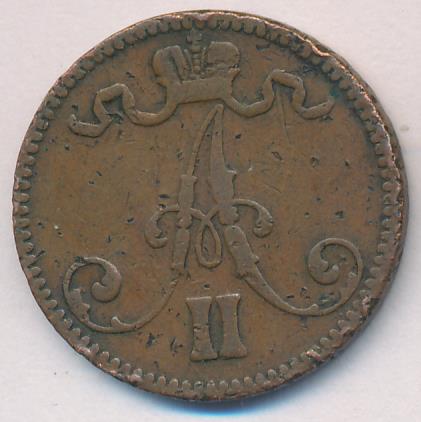 Лицевая сторона — вензель Александра II, оборотная — номинал (5 PENNIA) и дата. Нормативный вес — 6,40 грамма, гурт гладкий.