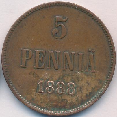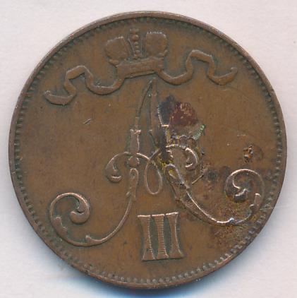 Лицевая сторона — вензель Александра II, оборотная — номинал (5 PENNIA) и дата. Нормативный вес — 6,40 грамма, гурт гладкий.