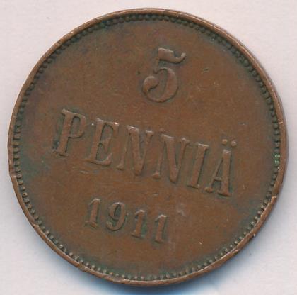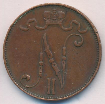 Лицевая сторона — вензель Александра II, оборотная — номинал (5 PENNIA) и дата. Нормативный вес — 6,40 грамма, гурт гладкий.