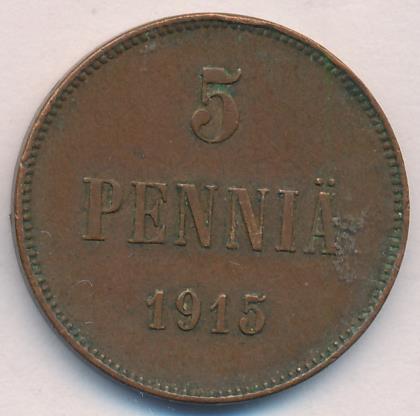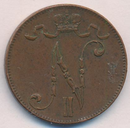 Лицевая сторона — вензель Александра II, оборотная — номинал (5 PENNIA) и дата. Нормативный вес — 6,40 грамма, гурт гладкий.