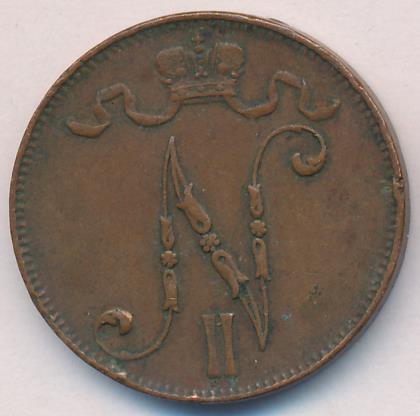 Лицевая сторона — вензель Александра II, оборотная — номинал (5 PENNIA) и дата. Нормативный вес — 6,40 грамма, гурт гладкий.