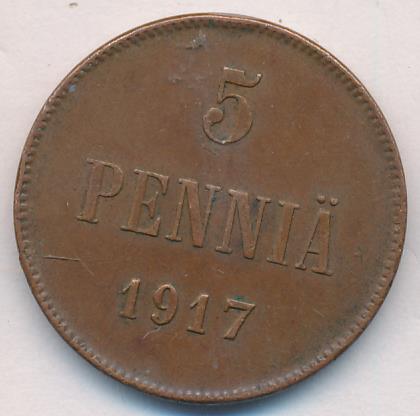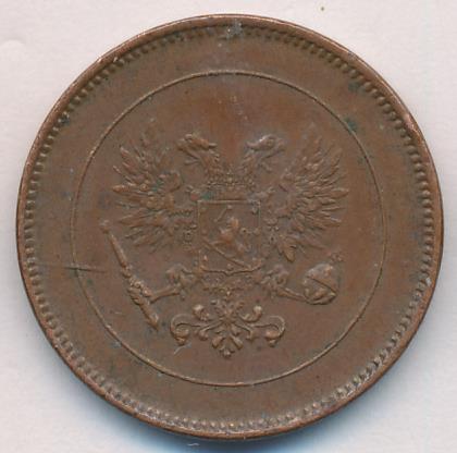 Лицевая сторона — вензель Александра II, оборотная — номинал (5 PENNIA) и дата. Нормативный вес — 6,40 грамма, гурт гладкий.