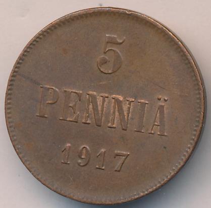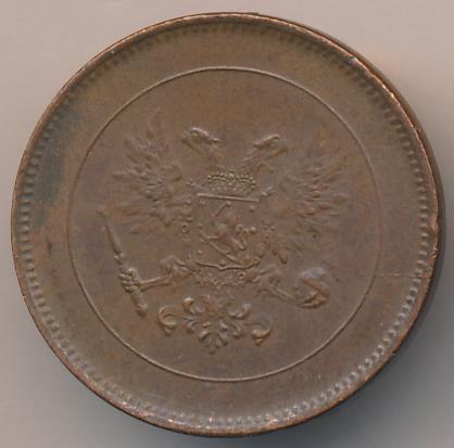 Лицевая сторона — вензель Александра II, оборотная — номинал (5 PENNIA) и дата. Нормативный вес — 6,40 грамма, гурт гладкий.