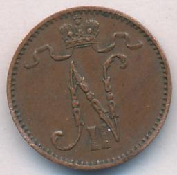 Лицевая сторона — вензель Александра II, оборотная — номинал (1 PENNIA) и дата. Нормативный вес — 1,28 грамма, гурт гладкий.
