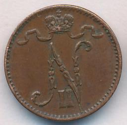 Лицевая сторона — вензель Александра II, оборотная — номинал (1 PENNIA) и дата. Нормативный вес — 1,28 грамма, гурт гладкий.
