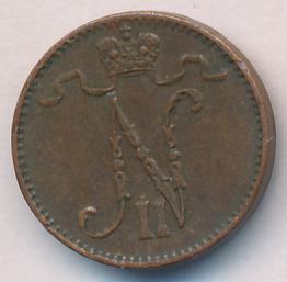 Лицевая сторона — вензель Александра II, оборотная — номинал (1 PENNIA) и дата. Нормативный вес — 1,28 грамма, гурт гладкий.