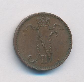 Лицевая сторона — вензель Александра II, оборотная — номинал (1 PENNIA) и дата. Нормативный вес — 1,28 грамма, гурт гладкий.
