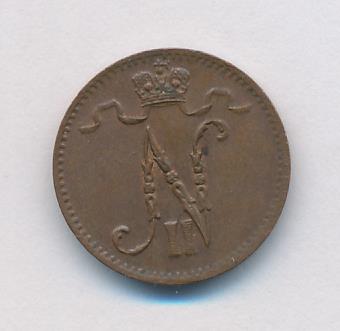 Лицевая сторона — вензель Александра II, оборотная — номинал (1 PENNIA) и дата. Нормативный вес — 1,28 грамма, гурт гладкий.