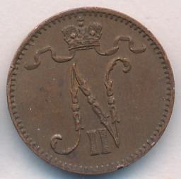 Лицевая сторона — вензель Александра II, оборотная — номинал (1 PENNIA) и дата. Нормативный вес — 1,28 грамма, гурт гладкий.