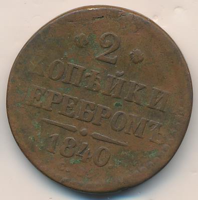 На новых монетах равенство серебряному курсу указано прямо в номинале: «2 КОПЕЙКИ СЕРЕБРОМ». Указ об их выпуске следует 6 сентября 1840 года («О новой медной монете на серебро 16-рублевого в пуде достоинства»). Массовая чеканка началось за год до этого на Екатеринбургском (знак ЕМ) и Сузунском (знак СМ) дворах. В качестве временной меры в 1840-1843 годах к ним подключается Ижорский завод (знак СПМ). С 1844 года после «значительного скопления медной монеты в народном обращении» в Екатеринбурге производство прекращается, а в Сузуне сокращается. Варшавский двор (знак MW), получив разрешение на выпуск общегосударственной монеты, успел отчеканить ее лишь в небольшом количестве в 1848 году.