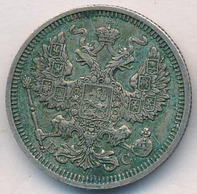 Лицевая сторона — гербовый орел, оборотная —обозначение номинала (20 копеекъ), окруженное венком из лавровой и дубовой ветвей и дата.