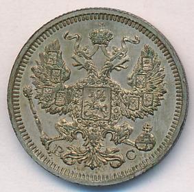 Лицевая сторона — гербовый орел, оборотная —обозначение номинала (20 копеекъ), окруженное венком из лавровой и дубовой ветвей и дата.