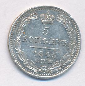 Лицевая сторона — новый гербовый орел с поднятыми крыльями, оборотная —обозначение номинала (5 копеекъ), окруженное венком из лавровой и дубовой ветвей и дата. Проба — 868, нормативный вес — 1,04 грамма.