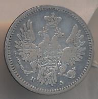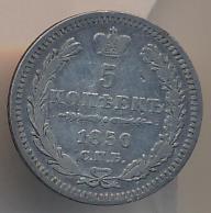 Лицевая сторона — новый гербовый орел с поднятыми крыльями, оборотная —обозначение номинала (5 копеекъ), окруженное венком из лавровой и дубовой ветвей и дата. Проба — 868, нормативный вес — 1,04 грамма.