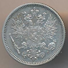 Лицевая сторона — российский двуглавый орел с гербом Великого княжества Финляндского на груди, оборотная — номинал и дата в венке из дубовых листьев. Проба — 750, нормативный вес — 2,55 грамма, гурт рубчатый.