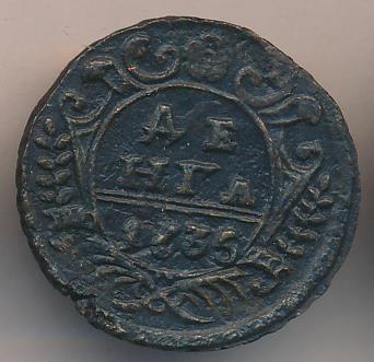 С 1730 года, как и 30 лет назад, медь возвращает себе статус разменных долей серебряной копейки — печатаются только денги и полушки. Указ от 22 декабря 1730 года регламентирует их выпуск на 10 рублей из пуда меди. Петровские копейки 20-рублевой стопы перечеканиваются в денги, а копейки Петра II 40-рублевой стопы — в полушки.