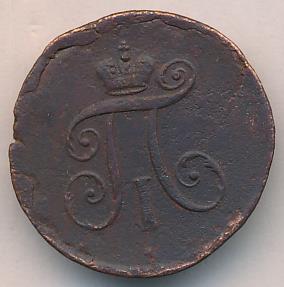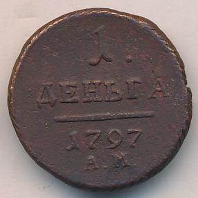 Лицевая сторона — вензель Павла I под короной, оборотная — номинал (1 деньга) и дата. Нормативный вес — 5,12 грамма, гурт — шнур.