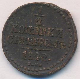 На новых монетах равенство серебряному курсу указано прямо в номинале: «1/2 КОПЕЙКИ СЕРЕБРОМ». Указ об их выпуске следует 6 сентября 1840 года («О новой медной монете на серебро 16-рублевого в пуде достоинства»). Массовая чеканка началось за год до этого на Екатеринбургском (знак ЕМ) и Сузунском (знак СМ) дворах. В качестве временной меры в 1840-1843 годах к ним подключается Ижорский завод (знак СПМ). С 1844 года после «значительного скопления медной монеты в народном обращении» в Екатеринбурге производство прекращается, а в Сузуне сокращается. Варшавский двор (знак MW), получив разрешение на выпуск общегосударственной монеты, успел отчеканить ее лишь в небольшом количестве в 1848 году.