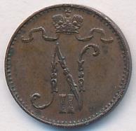 Лицевая сторона — вензель Александра II, оборотная — номинал (1 PENNIA) и дата. Нормативный вес — 1,28 грамма, гурт гладкий.