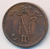 Лицевая сторона — вензель Александра II, оборотная — номинал (1 PENNIA) и дата. Нормативный вес — 1,28 грамма, гурт гладкий.
