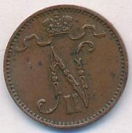 Лицевая сторона — вензель Александра II, оборотная — номинал (1 PENNIA) и дата. Нормативный вес — 1,28 грамма, гурт гладкий.