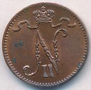 Лицевая сторона — вензель Александра II, оборотная — номинал (1 PENNIA) и дата. Нормативный вес — 1,28 грамма, гурт гладкий.