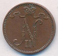 Лицевая сторона — вензель Александра II, оборотная — номинал (1 PENNIA) и дата. Нормативный вес — 1,28 грамма, гурт гладкий.