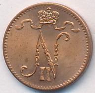 Лицевая сторона — вензель Александра II, оборотная — номинал (1 PENNIA) и дата. Нормативный вес — 1,28 грамма, гурт гладкий.