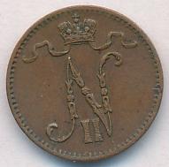 Лицевая сторона — вензель Александра II, оборотная — номинал (1 PENNIA) и дата. Нормативный вес — 1,28 грамма, гурт гладкий.