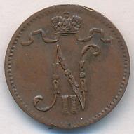 Лицевая сторона — вензель Александра II, оборотная — номинал (1 PENNIA) и дата. Нормативный вес — 1,28 грамма, гурт гладкий.