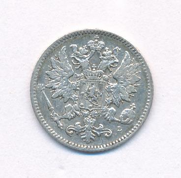 Лицевая сторона — российский двуглавый орел с гербом Великого княжества Финляндского на груди, оборотная — номинал и дата в венке из дубовых листьев. Проба — 750, нормативный вес — 1,27 грамма, гурт рубчатый.