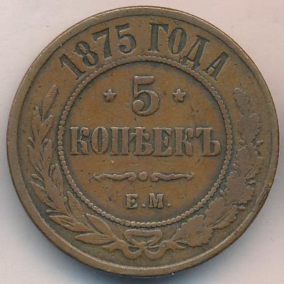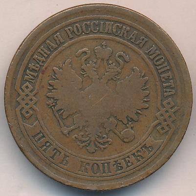 Лицевая сторона — двуглавый орел, надпись МЕДНАЯ РОССIЙСКАЯ МОНЕТА и обозначение номинала (пять копеекъ); оборотная — обозначение номинала (5 копеекъ) в бусовом ободке и дата. Нормативный вес — 16,38 грамма, гурт рубчатый.