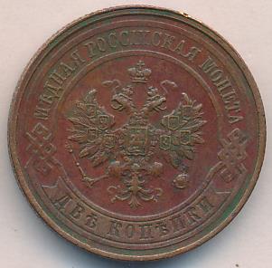 Лицевая сторона — двуглавый орел, надпись МЕДНАЯ РОССIЙСКАЯ МОНЕТА и обозначение номинала (две копейки); оборотная — обозначение номинала (2 копейки) в бусовом ободке и дата. Нормативный вес — 6,55 грамма, гурт рубчатый.