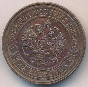 Лицевая сторона — двуглавый орел, надпись МЕДНАЯ РОССIЙСКАЯ МОНЕТА и обозначение номинала (две копейки); оборотная — обозначение номинала (2 копейки) в бусовом ободке и дата. Нормативный вес — 6,55 грамма, гурт рубчатый.