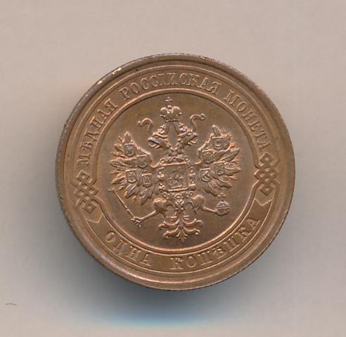 Лицевая сторона — двуглавый орел, надпись МЕДНАЯ РОССIЙСКАЯ МОНЕТА и обозначение номинала (одна копейка); оборотная — обозначение номинала (1 копейка) в бусовом ободке и дата. Нормативный вес — 3,28 грамма, гурт рубчатый.