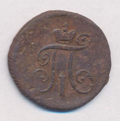 Лицевая сторона — вензель Павла I под короной, оборотная — номинал (1 деньга) и дата. Нормативный вес — 5,12 грамма, гурт — шнур.