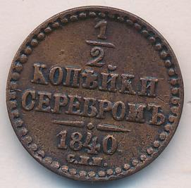 На новых монетах равенство серебряному курсу указано прямо в номинале: «1/2 КОПЕЙКИ СЕРЕБРОМ». Указ об их выпуске следует 6 сентября 1840 года («О новой медной монете на серебро 16-рублевого в пуде достоинства»). Массовая чеканка началось за год до этого на Екатеринбургском (знак ЕМ) и Сузунском (знак СМ) дворах. В качестве временной меры в 1840-1843 годах к ним подключается Ижорский завод (знак СПМ). С 1844 года после «значительного скопления медной монеты в народном обращении» в Екатеринбурге производство прекращается, а в Сузуне сокращается. Варшавский двор (знак MW), получив разрешение на выпуск общегосударственной монеты, успел отчеканить ее лишь в небольшом количестве в 1848 году.