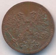 Лицевая сторона — вензель Александра II, оборотная — номинал (1 PENNIA) и дата. Нормативный вес — 1,28 грамма, гурт гладкий.