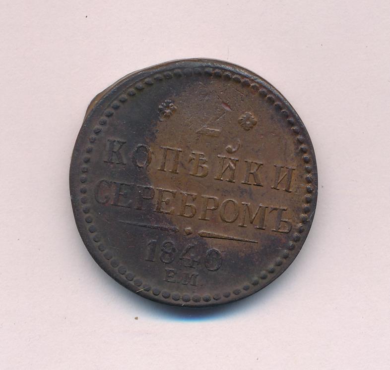На новых монетах равенство серебряному курсу указано прямо в номинале: «2 КОПЕЙКИ СЕРЕБРОМ». Указ об их выпуске следует 6 сентября 1840 года («О новой медной монете на серебро 16-рублевого в пуде достоинства»). Массовая чеканка началось за год до этого на Екатеринбургском (знак ЕМ) и Сузунском (знак СМ) дворах. В качестве временной меры в 1840-1843 годах к ним подключается Ижорский завод (знак СПМ). С 1844 года после «значительного скопления медной монеты в народном обращении» в Екатеринбурге производство прекращается, а в Сузуне сокращается. Варшавский двор (знак MW), получив разрешение на выпуск общегосударственной монеты, успел отчеканить ее лишь в небольшом количестве в 1848 году.