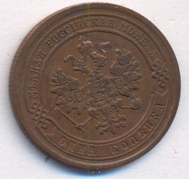 Лицевая сторона — двуглавый орел, надпись МЕДНАЯ РОССIЙСКАЯ МОНЕТА и обозначение номинала (одна копейка); оборотная — обозначение номинала (1 копейка) в бусовом ободке и дата. Нормативный вес — 3,28 грамма, гурт рубчатый.