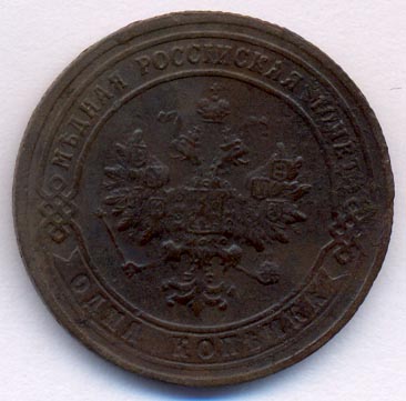 Лицевая сторона — двуглавый орел, надпись МЕДНАЯ РОССIЙСКАЯ МОНЕТА и обозначение номинала (одна копейка); оборотная — обозначение номинала (1 копейка) в бусовом ободке и дата. Нормативный вес — 3,28 грамма, гурт рубчатый.