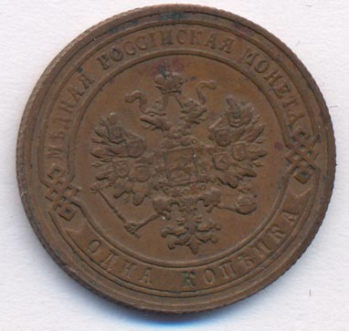 Лицевая сторона — двуглавый орел, надпись МЕДНАЯ РОССIЙСКАЯ МОНЕТА и обозначение номинала (одна копейка); оборотная — обозначение номинала (1 копейка) в бусовом ободке и дата. Нормативный вес — 3,28 грамма, гурт рубчатый.