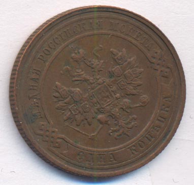 Лицевая сторона — двуглавый орел, надпись МЕДНАЯ РОССIЙСКАЯ МОНЕТА и обозначение номинала (одна копейка); оборотная — обозначение номинала (1 копейка) в бусовом ободке и дата. Нормативный вес — 3,28 грамма, гурт рубчатый.